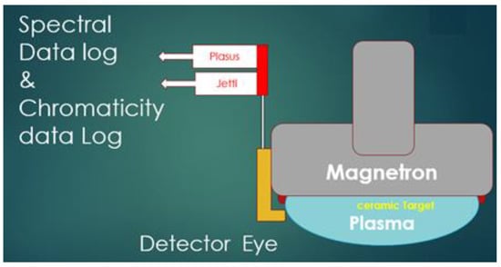 During each deposition procedure of one of the sample series (which will be discussed in detail), spectral data from the plasma were obtained using an in-vacuum collimator optic probe that was made by Plasus GmbH (Mering, Germany). The probe was installed on the magnetron so that it horizontally collected light from ~1.5 cm away from the surface of the target and at a distance of 4 cm from the edge of the target. The unique feature of the optic collimator is the honeycomb structure of the photon inlet, which traps the sputtering particle and prevents gradual coating of the collimator quartz windows. We have previously demonstrated how this technique will ensure that the collimator lens does not get coated during the sputtering procedure [11]. The collected light was then guided to a Plasus Emicon Spectrometer (Mering, Germany), which generates a detailed spectral plot of the emission. Emicon software (Plasus GmbH, Mering, Germany) coupled to the spectrometer was programmed to calculate the area under the peak of the spectral range based on pre-designated segments of the spectrum. A Jeti Specbos 1201 spectrometer (Jena, Germany) was used to calculate the chromaticity index of the light; the Jeti spectrometer was programmed so that for each measurement, it took 20 readings and inputted the average (Figure 2).