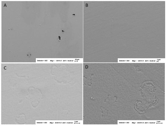 (A) The smooth homogenous surface of S6; (B) homogenous distribution of the film in sample S7 with an indication of orientation (linear marks); (C) secondary electron image of sample S2 showing “flower-like” structures; (D) secondary electron image of sample S5 showing “flower-like” structures.