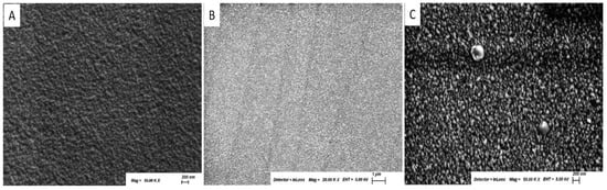 The nickel is constantly detected at 0.2 wt % in H0 and H3, while iron varies from not detected to 0.2 wt % in these two samples. In H6, nickel is still detected from 0.2 to 0.3 wt %, while iron varies from not detected in the majority of the areas analysed to below 0.2 wt %. Overall, the composition does not show dramatic differences between the three samples, while morphologically, H0 shows larger grains and a less uniform deposition compared to the other two samples, and the distribution of the grains improves also from H3 to H6, which shows the most uniform aspect (Figure 4A–C).