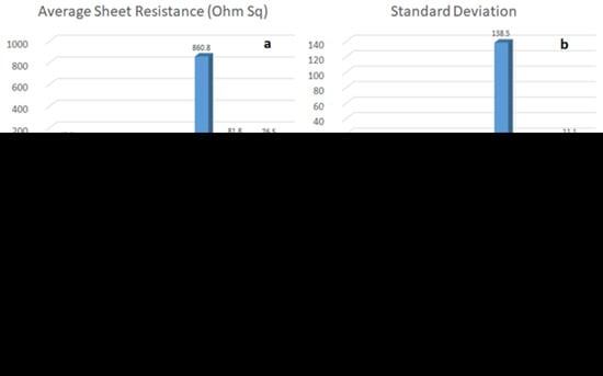 The IZO and ZnO coated substrates were tested for their electrical properties via a four-point probe and Hall effect measurement equipment. The Hall effect samples were 10 mm by 10 mm with contact pads connecting at ~1 mm into the sample from the corners. Figure 5 demonstrates the average sheet resistance of the four substrates belonging to the S1–S7 (IZO) and H0, H3, H6 (ZnO) samples along with the standard deviation of the data. The conductivity of the samples S1–S4 clearly shows improvement with each consecutive coating under the Ar + H gas. Sample S5 was prepared by switching the gas from Ar + H to Ar gas from the beginning of the process and we observe a very poor electrical conductivity in this sample, while the consistency of the results among the four substrates in the S5 group is significantly poorer than in the other. As for the samples S6 and S7, which were prepared under Ar gas following the processing of S5, there is an improvement in conductivity, but this does not reach the performance of the samples prepared under Ar + H gas (S1–S4).