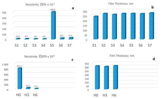 The resistivity of the samples and the thickness of the films are demonstrated in Figure 6. Apart from the sample S1, the rest of the films demonstrate a similar trend in terms of film thickness; however, the resistivity of the samples highlights what we already observed and discussed in Figure 5.