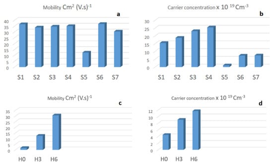 In Figure 7, we can see that the S1–S4 samples have similar mobility values, while the S5 is the poorest, and S6 and S7 are close to the samples coated under Ar + H gas. However, the carrier concentration data suggest that consecutive coating under Ar + H gas further improves the carrier concentration. The carrier concentration in the S4 sample is 5 times higher than the S6 and S7 samples; the S5 transition sample demonstrates the poorest results. The standard deviation values of the average sheet resistance give an indication of the error associated with electrical properties, considering the error associated with mobility and carrier concentration; the ‘S’ series samples show standard deviation values in the range of (0.33–0.48) for mobility values, with the exception of S5 sample having a standard deviation of 2.8 from the four samples prepared for each series. The standard deviation of carrier concentration in these samples was in the range of 3.9 × 1018 for S1–S5 and ~3.2 × 1017 for S6 and S7. The H series samples show standard deviation values of (0.25–0.33) for mobility and (3.1–3.9 × 1018) for the carrier concentration error in these samples.