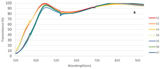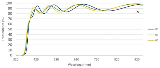 The optical transparency of the films was examined using UV-Vis spectroscopy, and the results are presented in Figure 8. As the four samples within each deposition procedure (S1, S2, H6) demonstrated a similar result, only ‘one’ sample from each set was used for these measurements (the results do not represent average values). Samples coated under Ar + H demonstrate very similar results with a clear indication of a wider bandgap allowing more light in the 320–430 nm region, and the samples coated under Ar are also very similar within their group. The S5 sample, which so far has been demonstrating poor performance in electrical properties, is no different than the S6 and S7 samples, which were also coated under Ar gas. The ZnO based samples (H series) demonstrate a wider transmission spectrum covering the shorter wavelengths, however, their band gap value is smaller than the IZO samples.