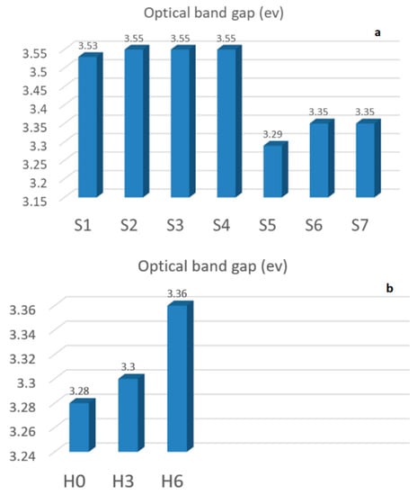Through the absorption data obtained, by applying a Tauc plot, the optical bandgap of the films was calculated, and the data are presented in Figure 9. The samples S1–S4, which were prepared under Ar + H, demonstrate a wider optical band gap, while the samples S5–S7 demonstrated a smaller optical bandgap. Here, the S5 sample again demonstrates smaller optical wavelength. The H series samples (ZnO) demonstrate an increase in optical band gap values as a result of prolonged exposure of the target to ArH gas.