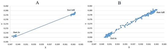 (A) The chromaticity colour functions, x and y, are plotted during the transition from Ar to ArH as the deposition of the S1 samples is undertaken. An instant jump in the index values is observed. (B) The switch to the Ar gas from the ArH during the S5 sample deposition demonstrates a gradual chaotic variation of the index values is observed, which is in an indication of unstable plasma emissions.
