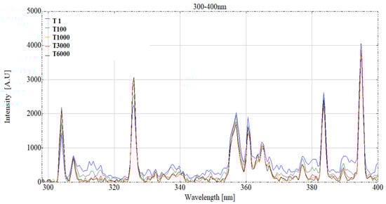 Given the specific characteristics of the S5 sample and the shifting of the colour functions during the transition from Ar + H to Ar, we focused on presenting and examining the plasma emissions during the S5 deposition process. The spectral data of the S5 sample at every 100 nm interval from 300 to 900 nm at various stages (from 1 s after the deposition process to 100, 1000, 3000 and 6000 s) of the process of the samples were examined. For simplicity, the 300 to 400 nm segment of the emission spectra is presented in Figure 11 as an example, and the rest of the spectral segments are discussed. From the spectral data it is observed that some emission peaks demonstrate an increase, decrease or no change through the deposition process.