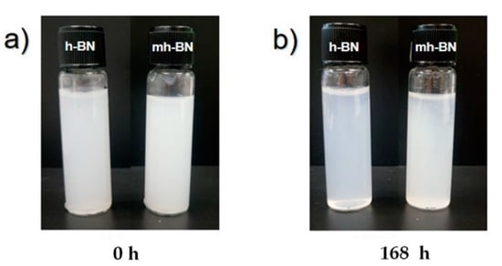 Dispersions of unmodified (h-BN) and plasma-modified (mh-BN) nanoparticles in water: (a) initially and (b) after 168 h standing.