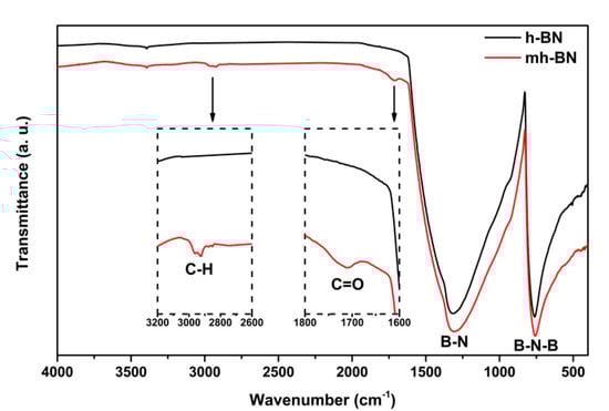 Infrared spectra of unmodified (h-BN) and plasma-modified (mh-BN) nanoparticles.