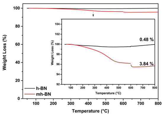 The thermal decomposition behavior of the organic film deposited by plasma was measured through the weight loss, as depicted in Figure 3. The thermogram of h-BN suggested a typical thermal decomposition behavior and a marginal weight loss of 0.49 wt.% at a temperature of 600 °C, attributable to the loss of humidity. mh-BN showed a weight loss of 3.84 wt.%, which was associated with the decomposition (chain scission reaction of the PAA chains and the degradation of the PAA chains into monomers) of the organic film deposited on the surface of h-BN [38,39,40].