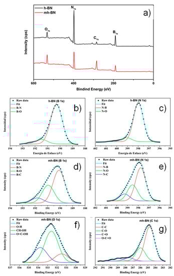 Figure 5b–g presents the high-resolution XPS spectra of B 1s, N 1s, O 1s, and C 1s, which unravel the chemical state structure of h-BN and h-BN50. The B 1s spectrum of the h-BN (Figure 5b) can be fitted by two curves, associated to B–N and B–O bindings energies located at 190.3 and 191.5 eV, respectively. The N 1s spectrum of h-BN (Figure 5c) can be fitted by two curves, associated to N–B and N–O bindings located at 398.0 and 399.0 eV, respectively. These energy values are similar to those previously reported in other studies [43,44,45,46,47].