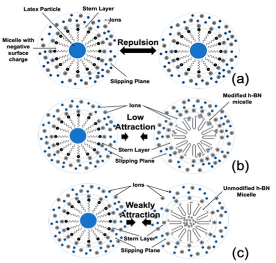 Scheme of possible Z potential behavior explanation between the different colloidal systems. (a) Emulsion (micellar) acrylic resin, (b) emulsion and modified h-BN micelle, and (c) emulsion and unmodified h-BN micelle.