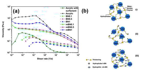 (a) Shear rheological curves of the acrylic resin and the formulations with unmodified (h-BN) and plasma-modified (mh-BN) nanoparticles, (b) the scheme of possible interactions between the latex nanoparticles, thickening and h-BN nanoparticles (i) acrylic resin (ii) acrylic coating with modified nanoplatelets and (iii) acrylic coating with unmodified nanoplatelets.