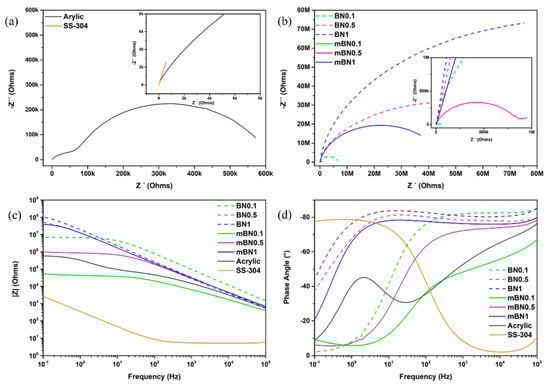 Nyquist plot for (a) acrylic resin and SS-304 and (b) formulations with nanoparticles; (c) Bode plots for phase angle vs. frequency and (d) impedance vs. frequency for different samples.