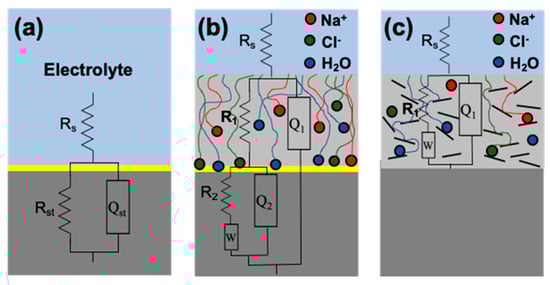 Electrochemical corrosion models: (a) SS-304, (b) acrylic coating and (c) nanostructured coatings.