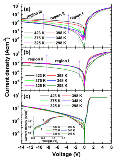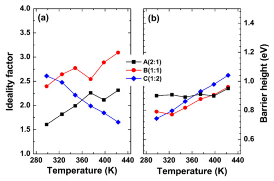 Figure 2 shows the I–V data measured at different temperatures. The increase of reverse current values with increasing the temperature was observed for sample A. This was not observed for samples B and C. In addition, the forward I–V curves for narrow voltage range in the inset in Figure 2c showed the occurrence of crossover at ~0.5 V. Using the thermionic emission (TE) model [20], both the Schottky barrier heights (SBHs) and ideality factors at each temperature were calculated, which are shown in Figure 3. For samples A and B, the ideality factor increased with the temperature. This indicates that the diode quality degraded and other transport mechanisms such as tunneling currents contributed to the current flow. For sample C, the ideality factor decreased and the barrier height increased over the whole temperature range, which can be associated with the lateral barrier inhomogeneity [20].