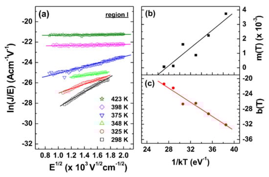 (a) Ln(J/E) vs. E1/2/plots by the Poole–Frenkel (PF) emission model, together with the linear fitting to the experimental data for sample A. (b,c) The calculated m and b values, respectively.