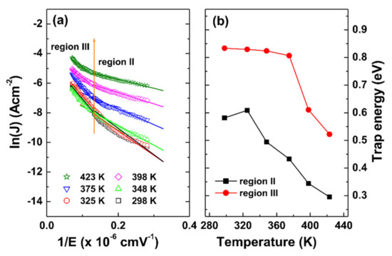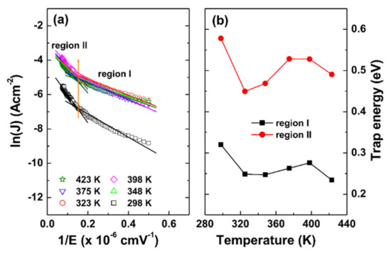 As shown in Figure 2b, the reverse current density for sample B is almost constant regardless of the temperature. In this case, PE emission was not appropriate, thus we applied TAT emission to sample B. As shown in Figure 6a, the plots are composed of two linear regions (regions I and II are also indicated in Figure 2b). The obtained trap energies at each temperature are shown in Figure 6b. At room temperature, the trap energies were 0.32 and 0.58 eV for regions I and II, respectively. The variance of the trap energies was not significant compared with sample A. In addition, both samples A and B showed that the extracted trap energies are higher at the high bias region than those at the low bias region. This is because, when the electric field is low, the electrons may tunnel through the trapezoidal barrier. As the reverse bias increases, the electrons may tunnel through the triangular barrier [33].