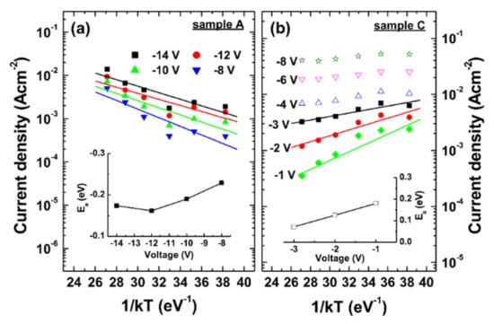 Reverse leakage current density vs. temperature at different reverse biases for samples (a) A and (b) C. The insets in (a) and (b) show the obtained activation energies for samples A and C, respectively.