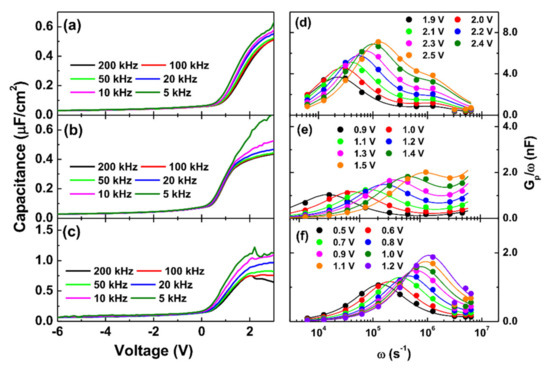 The conductance method was used to determine the trap density. The parallel conductance (Gp/ω) versus radial frequency (ω = 2πf) plots are described through the following equation [39]