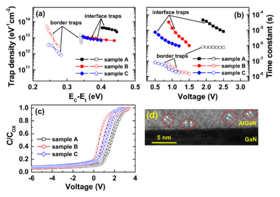 where vth, σn, and NC are the thermal velocity, the electron capture cross section, and the effective density of states in the conduction band of GaN, respectively. Using the values of vth = 2.6 × 107 cm·s−1, σn = 4 × 10−13 cm2, and NC = 2.2 × 1018 cm−3 [40], the trap densities and the time constants were calculated, which are shown in Figure 9a,b, respectively. The interface and bulk traps have different features in time constant. For the interface traps, the time constant reveals an exponential dependence on the applied voltage. On the contrary, the time constant for the bulk traps is insensitive to the bias voltage [41,42]. The interface traps distributed at 0.35–0.45 eV with the slow time constants between 1 and 50 μs were observed. For these traps, sample A showed the highest values. Relatively narrow energy distribution at 0.24–0.29 eV with the low time constants between 0.02 and 0.08 μs were observed for samples B and C, implying the fast interface traps. Whereas the border traps at ~0.34 eV were observed for sample A with the maintained time constant of 0.8 μs.