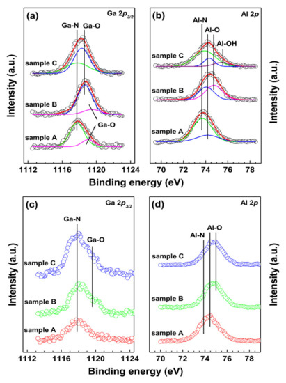 Figure 10a,b show the Ga 2p3/2 and Al 2p core level spectra, respectively, obtained from the AlGaN surface. The Ga 2p3/2 spectra showed the peaks associated with Ga–N from the AlGaN (~1117.8 eV [46]) and Ga–O (~1118.5 eV [46] and ~1119.2 eV [47]) from the surface. The integrated intensity ratios of [Ga–N]/[Ga–O] were calculated to be 4.04 and 0.62, for samples A and C, respectively. For sample B, the Ga–N peak was not observed clearly. The Al 2p spectra show the peaks consistent with Al–N bonding (at ~73.6 eV) and Al–O bonding (at ~74.5 eV) [46], with additional peaks at ~74.2 and ~75.6 eV related to AlOx and Al–OH, respectively [47]. Likewise, the integrated ratios of [Al–N]/[Al–O] were found to be 2.55, 0.12, and 2.34, for samples A, B, and C, respectively. These results indicate the clearer formation of the AlGaN layer and the presence of less oxygen-related bonding for sample A as compared with samples B and C. In addition, the incorporation of N atoms into the AlGaN layer occurred more effectively for sample A, related to the positive shift of flatband voltage. Figure 10c,d show the Ga 2p3/2 and Al 2p core level spectra, respectively, obtained from the AlGaN layer, where the etch depth was 5 nm. The integrated ratios of [Al–N]/[Al–O] were found to be 0.34, 0.03, and 0.17, for samples A, B, and C, respectively. Like the XPS spectra in Figure 10a,b, these also show that the oxygen-related bonding was formed more clearly for samples B and C. Therefore, the AlN and GaN pulse ratio of 2:1 could show less oxygen-related defects in the AlGaN layer. According to AES analysis, it was found that oxygen content reached 7 to 15 at.% in the AlGaN films grown on Si substrate. XPS analysis revealed that oxygen content in the AlGaN films on GaN substrate reached ~20 at.%. These values are higher than the value of 1.5–3 at.% in the plasma-assisted ALD-grown AlGaN film at 200 °C [18]. Oxygen could be incorporated from the surface oxidation when the film surface was exposed to air after the high temperature deposition process. In addition, water and oxygen gas molecules remain when the ALD chamber is open during loading/unloading the samples, and thus TMA could react with the remnant oxygen gas during the deposition process [48,49].