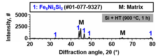 Figure 1 shows the results of XRD analysis on SS 316LN after Si deposition and IDHT (900 °C, 1 h). Other than the peaks from the matrix, peaks of Fe5Ni3Si2 silicide phase were detected. Surface SEM micrograph shows that a continuous surface layer with somewhat blocky morphology was formed (Figure 2a). Cross-sectional backscattered electron (BSE) micrograph of the specimen is shown in Figure 2b. A surface layer with different contrast from the adjacent matrix can be identified. This region would correspond to Fe5Ni3Si2 silicide phase detected by XRD analysis. Figure 2c shows the result of EDS line scanning along the dotted arrow indicated in the BSE micrograph. The surface region is enriched in Si about 10 wt.% and about 9 μm in thickness. In addition, Fe, Ni, and Cr contents in this layer are about 45, 18, and 14 wt.%, respectively. This indicates that interdiffusion of the deposited Si layer and elements in the matrix occurred during heat treatment at 900 °C, and formed Fe5Ni3Si2 phase. Previously, Zhang et al. evaluated the phase equilibria of Fe-Ni-Si system at 850 °C and confirmed Fe5Ni3Si2 phase as thermodynamically stable phase in Fe and Ni composition ranges of 46.5–56.3 at.% and 23.6–32.5 at.%, respectively [8].