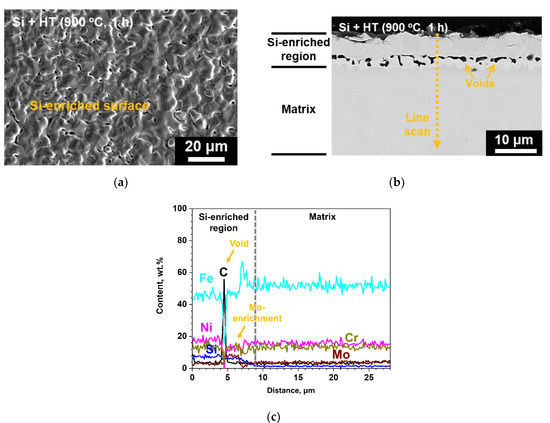 Meanwhile, discontinuous voids were observed in the Si-enriched layer. High C region in EDS line scan result (Figure 2c) corresponds to the void, as the voids were filled by C-rich resin during sample mounting for cross-sectional analyses. These voids would have formed during heat treatment due to faster outward diffusion of matrix elements toward the Si coating layer. Perez et al. also reported formation of voids on Si diffusion-coated SS 304 at the coating/alloy interface [9]. Such Kirkendall voids may be avoided by optimization of heat treatment temperature. On the other hand, relative enrichment of Mo was noted adjacent to the voids (Figure 2c). The change in chemical compositions due to Si-enrichment at the surface during heat treatment would result in activity changes, which in turn would have resulted in Mo diffusion from the underlying matrix toward the coating/matrix interface. This is indicated by depletion of Mo below the region of Mo-enrichment shown in EDS line scan result (Figure 2c).