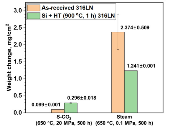 Weight changes of the as-received and surface-modified SS 316LN after exposure to S-CO2 (650 °C, 20 MPa, 500 h) and steam (650 °C, 0.1 MPa, 500 h) environments.