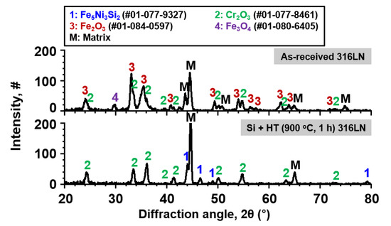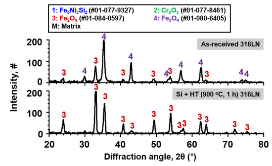 Furthermore, results of XRD analysis conducted on the as-received and surface-modified SS 316LN after steam corrosion test at 650 °C (0.1 MPa) for 500 h are shown in Figure 11. For the as-received specimen, peaks of Fe2O3 and Fe3O4 oxides were detected, while only Fe2O3 was detected for the surface-modified SS 316LN. Matrix peaks were not detected for both specimens, because of the thickness of the oxides as seen in the cross-sectional BSE images. In previous works in which duplex oxide were formed on FMS after high temperature exposure, it was reported that the outer Fe-rich oxide was composed of outermost Fe2O3 layer under which Fe3O4 was formed [18,19]. It was proposed that Fe3O4 initially forms, when the supply of Fe to the oxidation front is sufficiently high. With continued growth and increase in thickness of Fe3O4 layer on FMS, outward diffusion of Fe cations from the matrix to the oxidation front decreases. Consequently, at some point during oxidation, Fe2O3 forms at the outermost region above Fe3O4, as Fe2O3 is stable at higher oxygen activities compared to Fe3O4 [20]. This mechanism could be applied to the as-received SS 316LN oxidized in steam in this study, in view of its oxide products (Fe2O3 and Fe3O4) and structure (duplex oxide). On the other hand, the absence of Fe3O4 for the surface-modified specimen would be due to the formation of Si-rich oxides, which hampered outward diffusion of Fe ions. Therefore, it is quite apparent that Si-rich oxides formed on the surface-modified alloys contributed to slower corrosion kinetics in high temperature steam environment.
