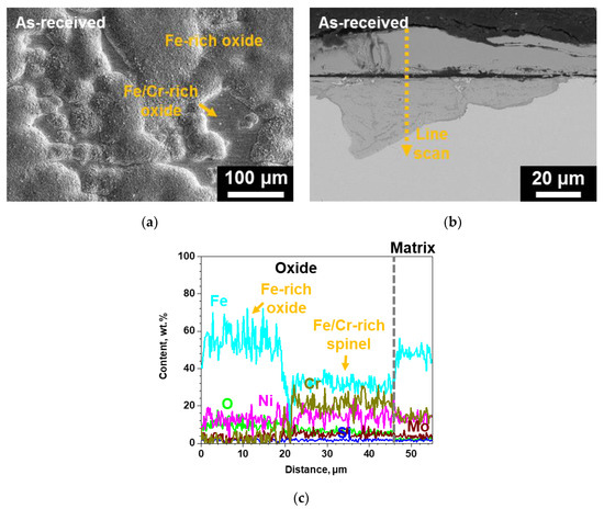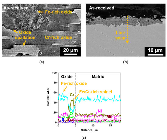 Figure 4 shows the results of XRD analysis of the as-received and surface-modified SS 316LN after exposure in S-CO2 at 650 °C (20 MPa) for 500 h. For the as-received SS 316LN, peaks of chromia (Cr2O3) and Fe-rich oxides (mainly Fe2O3) were found. For the surface-modified specimen, chromia peaks were detected, along with peaks of Fe5Ni3Si2 phase and matrix that were observed before corrosion test (Figure 1). Figure 5a shows the plan-view SEM micrograph of the oxides formed on the as-received SS 316LN after S-CO2 exposure. Severe spallation of a thin oxide layer and formation of thick oxides can be noted. EDS analysis (not shown) confirmed that the thin oxide layer was mainly rich in Cr while the thick oxide was rich in Fe, which is in agreement with previous studies [1,2]. Cross-sectional backscattered electron (BSE) micrograph of this specimen is shown in Figure 5b. The Cr-rich oxide layer was difficult to find due to spallation, while thick Fe-rich oxide region was seen. EDS line scan results indicated that this oxide was about 5 μm in thickness, while it consisted of a duplex structure with outer oxide being Fe-rich and inner oxide being rich in both Fe and Cr (Figure 5c). Such oxides would have formed because of depletion of Cr in the underlying matrix after oxide spallation.