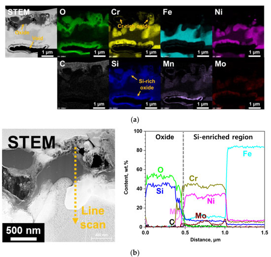 TEM analyses results of the oxide layer formed on the surface-modified specimen after S-CO2 exposure are shown in Figure 7. The oxide is mainly rich in Si, while some discontinuous Cr-rich oxides can also be observed. It is interesting to note that Si-rich oxides were not observed in XRD analysis results, while only chromia peaks were found (Figure 4). This would be due to the amorphous nature of the Si-rich oxide, so that diffraction peaks could not be detected by XRD. SiO2 is reported to be typically amorphous under 1000 °C [13], and its formation has been reported for various Si-containing alloys at the oxide/matrix interface after exposure to high temperatures oxidizing environments [3,14,15]. Meanwhile, one of the voids that was observed in the Si-enriched region of surface-modified alloy (Figure 2) after S-CO2 exposure can be seen in Figure 7a. Oxidation occurred around the voids, and the formed oxides were mainly Si-rich.