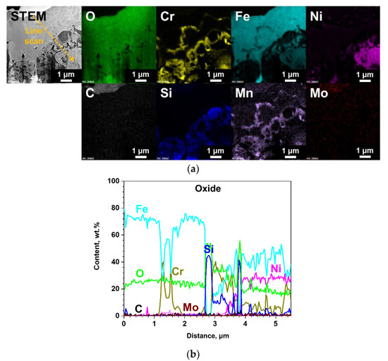 Meanwhile, it should be noted that thickness of the oxide layer formed on the surface-modified alloy in steam environment is about 15 μm (Figure 9), which is greater than the thickness of the Si-enriched region of 9 μm (Figure 2). This implies that the oxide growth in steam extended to below the entire surface-modified region. Voids found in the Si-enriched region for surface-modified alloy (Figure 2) could not be observed along the entire sample. In addition, the Si content below the oxide layer of the surface-modified alloy in steam is about 1 wt.%, which is similar content as that detected in the matrix of the as-received SS 316LN. Despite the Si depletion after steam oxidation, surface Si-enrichment was effective in enhancement of oxidation resistance. However, sub-oxide depletion of an element participating in oxidation is a concern in oxide stability and there is a need for longer exposure tests in order to further validate the effectiveness of the surface-modification.