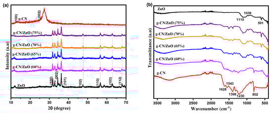 (a) XRD pattern of g-CN, ZnO, g-CN/ZnO (60%), g-CN/ZnO (65%), g-CN/ZnO (70%), and g-CN/ZnO (75%). The Powdered XRD pattern for composite corresponds to pure ZnO (wurtzite); (b) and its corresponding Fourier transform infrared (FT-IR) spectra of fabricated materials.