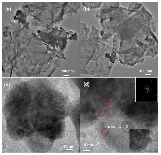 To further assess the morphological features of fabricated composites, the HR-TEM measurements were carried out and are depicted in Figure 3. HR-TEM images of g-CN/ZnO (75%) composite as seen in Figure 3a,b, clearly observed the darker particles of ZnO over the thin layer sheets of g-CN, which is consistent with FE-SEM analysis. Furthermore, HR-TEM of a composite at higher magnifications to observe more number of fringe patterns of ZnO particles over g-CN sheets (Figure 3c,d). The observed interplanar distance (d) of 0.252 nm is observed to have matched with the lattice fringe spacing of the (101) ZnO hexagonal wurtzite phase, which also reveals the interface between the hexagonal ZnO and g-CN sheets []. Inset of Figure 3d reveals the respective selected area electron diffraction (SAED) pattern of g-CN. These morphological investigations evidenced the interface between g-CN nanosheets and ZnO particles in the composites and are appropriate candidate materials to enhance the charge-separation and thereby enhancement of the PCA.