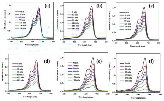UV-Vis absorbance spectra of visible-light degradation of methylene blue (MB) dye in the presence of (a) bare-ZnO, (b) undoped g-CN, (c) g-CN/ZnO (60%), (d) g-CN/ZnO (65%), (e) g-CN/ZnO (70%), and (f) g-CN/ZnO (75%).