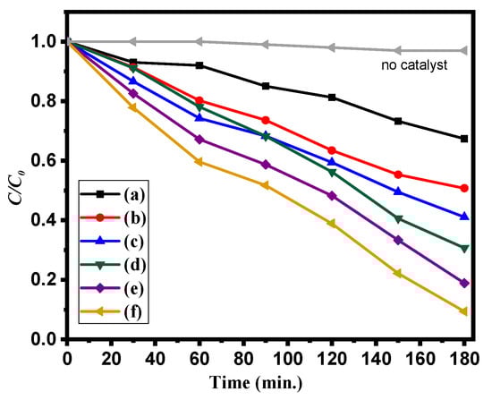 Figure 5 reveals the photodegradation of MB over bare-ZnO, undoped g-CN, and a series of g-CN/ZnO composites. The blank analysis was performed without a catalyst to determine the stability of MB under illumination conditions and the results indicated that the MB was stable under illumination. Figure 5 shows the kinetic plot of (C0/Ct) vs. irradiation time (min) to examine the degradation of MB dye in the presence of as-prepared catalysts.