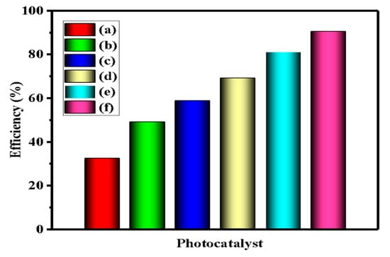 Photodegradation of MB dye over the presence of: (a) bare-ZnO, (b) undoped g-CN, (c) g-CN/ZnO (60%), (d) g-CN/ZnO (65%), (e) g-CN/ZnO (70%), and (f) g-CN/ZnO (75%).
