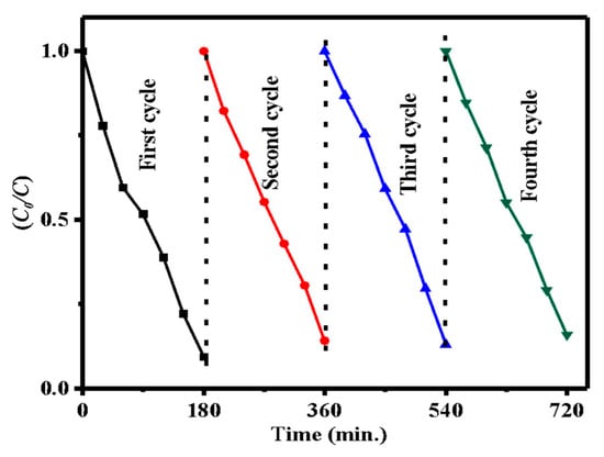 The stability of the synthesized catalyst materials was examined by recycling the photocatalysts for the photocatalytic degradation of MB dye. Each cycle, a fresh MB dye solution was used for the next photocatalytic test. The catalyst particles were collected by centrifuged and washed, with distilled water then reused. As shown in Figure 9, no major reduction was observed in the efficiency after four consecutive cycles, as a result, the g-CN/ZnO (75%) photocatalysts were photostable.