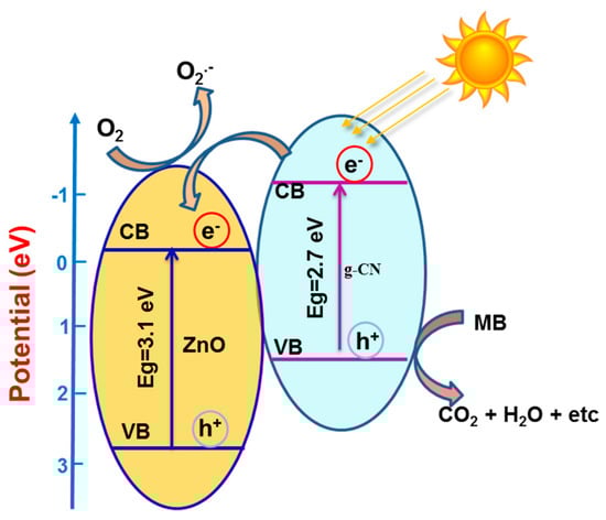 The apparent charge-transfer mechanism for MB degradation over g-CN/ZnO system was presented in Figure 10. As it is known that, the pure ZnO cannot be excited by visible light irradiation, the photodegradation of MB can mainly be attributed to the photogenerated hole oxidation and photoreduction process. On comparing pure g-CN, the g-CN/ZnO photocatalysts exhibited remarkable enhancement for degrading MB under visible light. The CB and VB edge potentials of as-synthesized pristine ZnO and g-CN were acquired from Butler–Ginley method [,]. The CB and VB edge potentials of the g-CN were calculated to be −1.12 and +1.57 eV, while the CB and VB edge position of ZnO are −0.26 and +2.83 eV, respectively. The appropriate band positions of g-CN and ZnO endorse the creation of the heterojunction and thereby improvement in PCA. According to the proposed mechanism, both ZnO and g-CN are expected to be photoinduced to create carriers. Under VLI conditions, since the CB potential of g-CN is more negative than that of ZnO, the photogenerated electrons on g-CN particle surfaces transfer easily to ZnO through the well-developed interface []. So the excited electron on g-CN could directly inject into the CB of ZnO. The electron-hole separations are also driven by the internal reassembly rebuilt electric fields in the two semiconductors. This decreases the strength of electron-hole recombination and leads to large numbers of electrons on the ZnO surface and holes on the g-CN surface, respectively, thus promoting the photocatalytic reactions to degradation MB.
