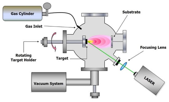 The scheme of typical experimental apparatus is reported in Figure 1, and basically, it consists of a laser source, a vacuum chamber equipped with a target holder, a gas inlet to fill the chamber with a buffer gas and a substrate holder, often heatable, in a suitable position. In general, the laser beam impinges on the target with an angle of 45°, and the substrate is positioned in front of the target, but the geometry of the system can be varied to allow the performing of different diagnostic methods or for particular purposes. The use of shadow masks makes it possible to adjust the effect of particles ejected from the target on the performance of the coatings []. The application of pulsed electric fields during the expansion of the laser-initiated plasma causes the high-energy ion implantation and the ion mixing of materials at the film-substrate interface []. Anyway, the majority of the PLD experiments reported in literature have been carried out with an experimental apparatus of the type shown in Figure 1.