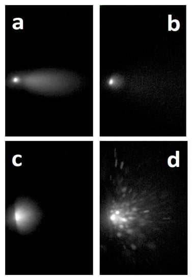 When the plasma produced in vacuum by ultra-short PLA was analyzed using Optical Emission Spectroscopy (OES), two different emissions of material, occurring at very distinctive time delays in respect to the laser pulse and with different composition and velocity were detected by Albert and co-workers []. During the first microsecond a luminous plasma developed, the so-called primary plume, whose spectrum presented emission lines corresponding to atoms and small molecules. When the luminescence of this plasma component was quenched, a second material emission took place. The peculiar feature of this secondary plume was related to its blackbody-like emission, which, depending on the type of material, could last up to several tens of microseconds []. From the spectra it was evident that the primary plume gaseous phase was formed by neutral and ionized atoms, molecules and small clusters. In contrast, as evidenced by the blackbody-like continuum emission spectrum, the secondary component was formed of particles or large clusters [,,]. The velocity of these two plumes was very different. In the case of the primary plume, the front velocity was of the order of 106–107 cm/s, whereas the value was ~104 cm/s in the case of the secondary one. In addition, in some cases, a third emission of material in the form of microparticles was detected [,,] (Figure 2). What is the reason for these different emissions of material?