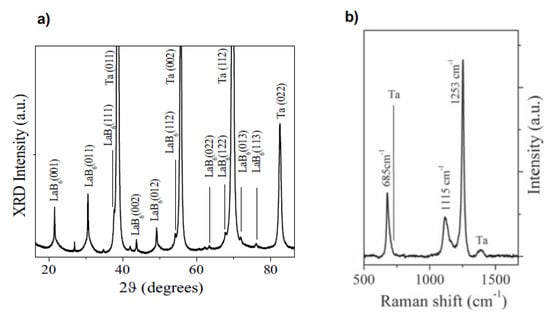 (a) XRD pattern and (b) Raman spectrum of LaB6 thin films deposited using fs PLD. Reprinted with permission from []. Copyright 2019 Elsevier.