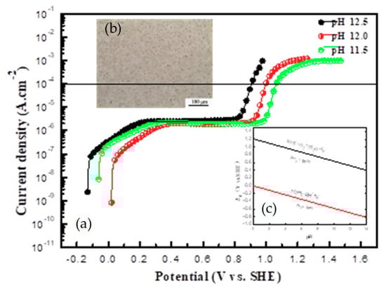 For the reliability of the data, repeated experiments were performed. Since the experiment was reproducible in a chlorine-free environment, each set of data was repeated five times. Figure 2 depicts the effect of pH on the anodic polarization curves for the samples in saturated Ca(OH)2 solution without chloride ions. It showed that in the anodic polarization region, passivation zones appeared, whose current densities remained stable in the order of 10−6 A/cm2, and the breakdown potentials decreased with the increase of pH. But it seemed to contradict the conventional understanding. Traditionally, the higher the pH value, the more positive the breakdown potential is, which is indicated that the corrosion resistance of steel is enhanced. Numerous investigations [33,34,35,36] have demonstrated the fact that the carbonation of concrete (where pH decreases) always renders corrosion of reinforcing steel. Due to the presence of an oxygen evolution reaction, there is an upper limit value of the steel pitting potential, which is the oxygen evolution potential of the system.