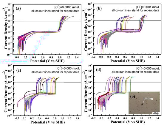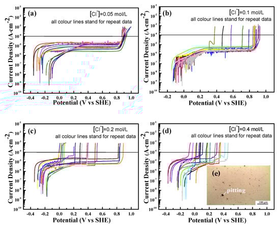 The Figure 3a–d showed that the steel can be passivated in all these test solutions. Compared with the previous conditions (without chloride ions), pitting corrosion occurred after the current mutation at the “breakdown potential” (Figure 3e). When the concentration of chloride ion was low (0.05 mol/L), the pitting potentials centered around 0.9 V for the twenty replicate test data. With the increase of the chloride ions concentration, the breakdown potentials gradually shifted toward the negative direction (from 0.9 to 0.4 V), and the discreteness of replicate data was strikingly enhanced. This indicates that the pitting corrosion of the steel under these circumstances is a random process with great uncertainty. Therefore, an investigation result from a small amount of electrochemical test data may render a misunderstanding of the rebar corrosion. It may also be one of the reasons that the [Cl−]th reported in the documents [17,20,21,22,23] cannot reach a consensus.