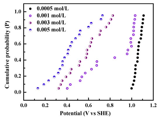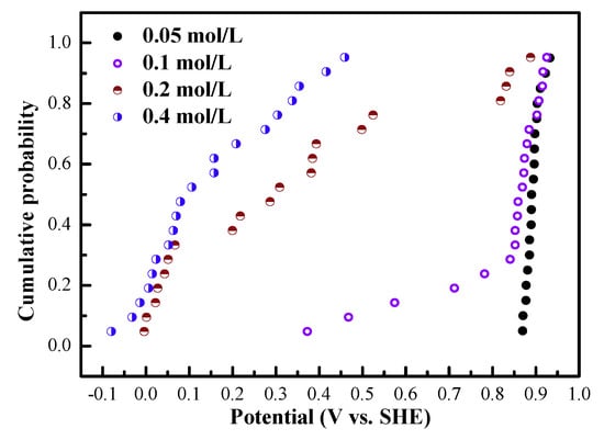 It can be seen in the Figure 4 that with the increase of chloride concentration, the pitting potentials decrease toward the negative direction, and the distribution of pitting potentials under each chloride-containing solution becomes more and more scattered. For the 0.05 mol/L chloride concentration, the pitting potential is almost around 0.9 V, which is similar to the condition without chloride ions (0.89 V). When the chloride concentration reaches 0.1 mol/L, the cumulative probability distribution of the pitting potential shows two-segment characteristic, indicating that the pitting potential is affected by two factors, that is, the random characteristics of pitting itself and the upper limit of the oxygen evolution potential. When chloride concentration reaches 0.4 mol/L, the effect of the oxygen evolution is minor, and the cumulative probability showed the random distribution characteristics similar to the “F” shape, indicating that the scattered pitting potential distribution is mainly caused by chloride ions [40]. Therefore, [Cl−]th is about 0.1–0.2 mol/L at the pH 12.5. Similarly, Figure 5 shows the polarization curves of HRB400 specimens in simulated concrete pore solutions containing various chloride concentration at the pH 12.0.