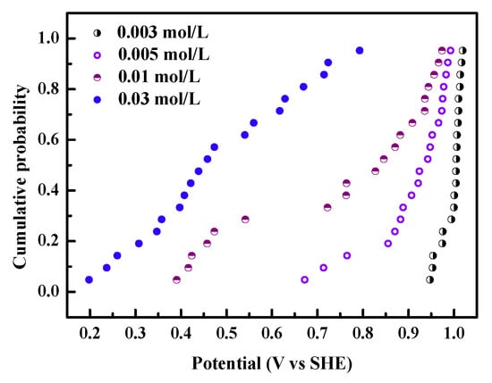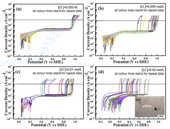 When the chloride concentration is as low as 0.003 mol/L, the pitting potential is almost around 0.96 V, which is similar to the condition (0.99 V) without chloride ions in Figure 5. This value of the current density decreases one order when compared with that under the condition of pH 12.5. With the increase of chloride concentration, sever pitting can be observed (Figure 5e) and the pitting potentials greatly decrease. Simultaneously, the pitting potentials distribute more and more randomly. The change of cumulative probability can be seen in the Figure 6.