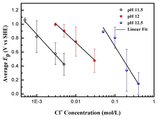 The average values of the pitting potential (Epit) for each of the twenty repeated data with various chloride concentrations at three pH conditions were shown in Figure 9. The relationship between them is well corresponded to the Equation (6), which has been demonstrated by many investigations [32,41],
