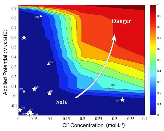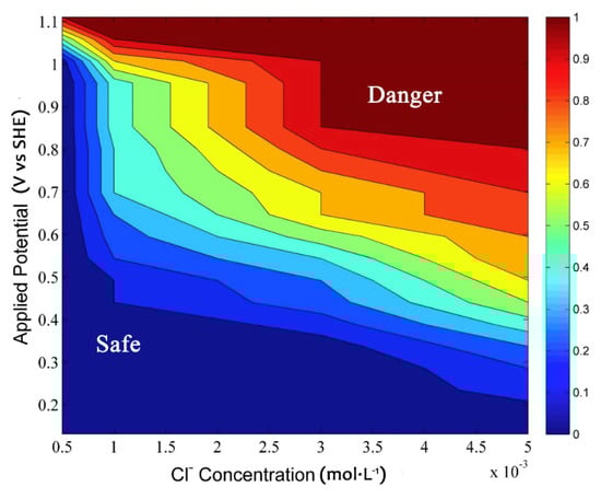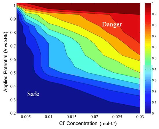 This indicates that with the increase of chloride concentration, Y increases. Y can be considered as the area constituted by Eapp and chloride concentration in Figure 10. In the combined Equations (6) and (8), the low applied potential environment has a markedly higher [Cl−]th. That is, it is safe for a steel bar in a higher chloride concentration environment at lower applied potential. This is very consistent with some investigations on the cathodic protection of steel bars under chloride-containing environments [44,45]. Figure 10 shows that, even if the applied potential is no more than 0.5 V, the probability of the pitting corrosion of the reinforcement is 50% when the chloride concentration is 0.15–0.2 mol/L. When the chloride concentration is high (0.4 mol/L), the probability of the pitting corrosion occurs more than 80%. To ensure that the probability of the pitting corrosion of the steel structure is less than 10% [46], a safe zone was marked in blue and a danger zone was marked in red in Figure 10. Although the diagram does not provide the information of the actual corrosion rate, it can be easily used to assess pitting tendency in a chloride ion environment at pH 12.5.