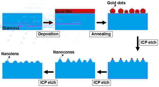The substrate used in this work was a chemical vapor-deposited (001) diamond measuring 3 × 3 × 0.5 mm3. N-V centers were prepared with nitrogen doping during the diamond growth process. Firstly, the substrate was dipped into a mixed acid of H2SO4:HNO3:HClO4 (volume ratio: 31.2:36:11.4) at 250 °C for 1 h and a mixed alkali of NH4OH:H2O2:H2O (volume ratio: 4:3:9) at 80 °C for 10 min to remove the non-diamond phase. Secondly, the implanted layer was epitaxially grown on the as-washed substrate using microwave plasma chemical vapor deposition equipment (AX6500 Seki Technotron Corporation, Tokyo, Japan). During growth, the typical growth parameters were as follows: a total gas pressure of 100 Torr, a H2 gas flow rate of 500 sccm, a N2/CH4 ratio of 4.3 ppm. The growth time was 10 h and the thickness of the implanted layer was estimated to be 100 µm. Details of the growth conditions are presented in Table 1. The layer was expected to result in a uniform N distribution in the substrate. The density of N in the as-grown diamond was about 1016 cm−3, while the 2D density was deduced to be 1014 cm−2. The as-grown diamond was polished on the growth side and laser-cut into several small samples. After the above processes, nanostructures were prepared on each sample. Figure 1 shows the fabrication flow chart for nanostructures. Gold films with thicknesses ranging from 2 to 40 nm were deposited on diamond by electron beam evaporation. Then, the samples were held in a furnace for annealing at the desired temperature for various times to achieve well-distributed gold dot masks. The Ar gas was introduced into the furnace to avoid sample oxidation. After annealing, gold dot masks were obtained.