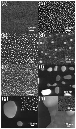 In the second experiment, gold films with thicknesses of 3, 10, 20, and 40 nm were annealed at 800 °C for 5 min, the results of which are shown in Figure 2e–h, respectively. From the results, the size of the gold dots increased with the increasing film thickness. When the thickness was above 10 nm, the shape of the gold dots became irregular and partially continuous, as shown in the inset in Figure 2g,h, respectively. The temperature-dependent phenomenon could be because the dewetted gold dots melted and converged together into larger dots with the increasing annealing temperature. Meanwhile, the thickness dependence results may be ascribed to the sizes of the initial nucleation points, which were dependent on the film thickness, determining the final shape of the dewetted dots. Since the dots used in one popular work study gold spheres rather than a thin film [30], the mask thickness was thicker, resulting in a better etching resistance for such a small size structure.